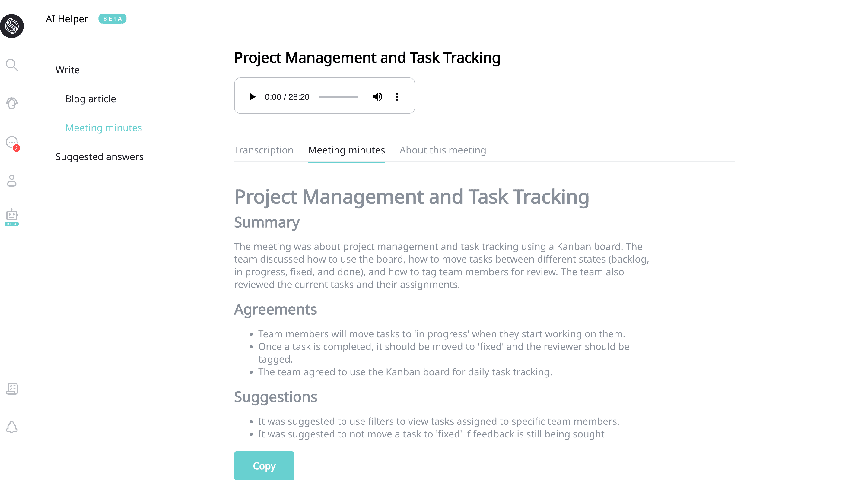 - Meeting Minutes The AI-generated summary of the meeting is housed here. It sections like Summary, Agreements, Suggestions, Action Items, and Detailed Summary, all bulleted for ease of understanding.