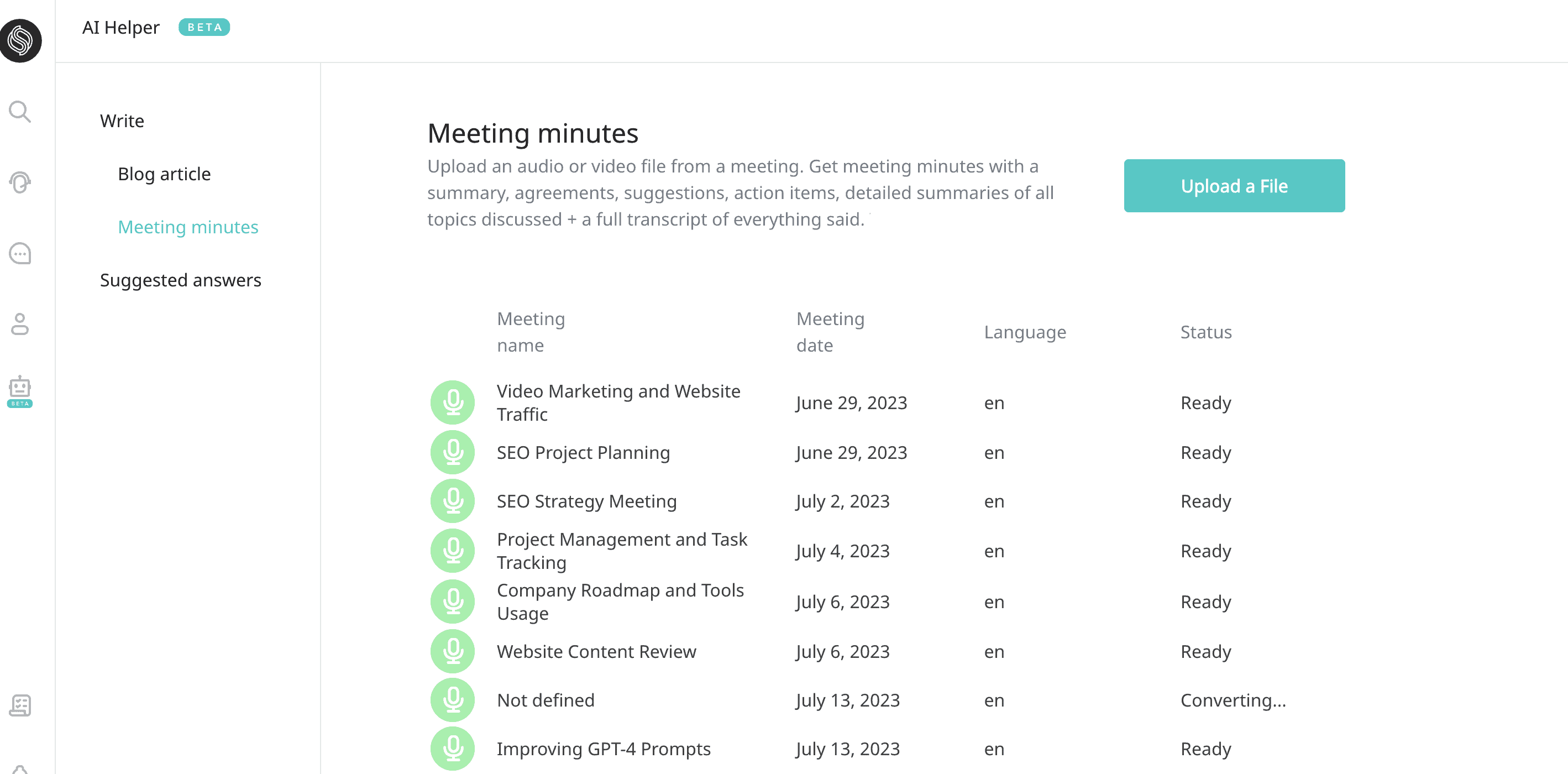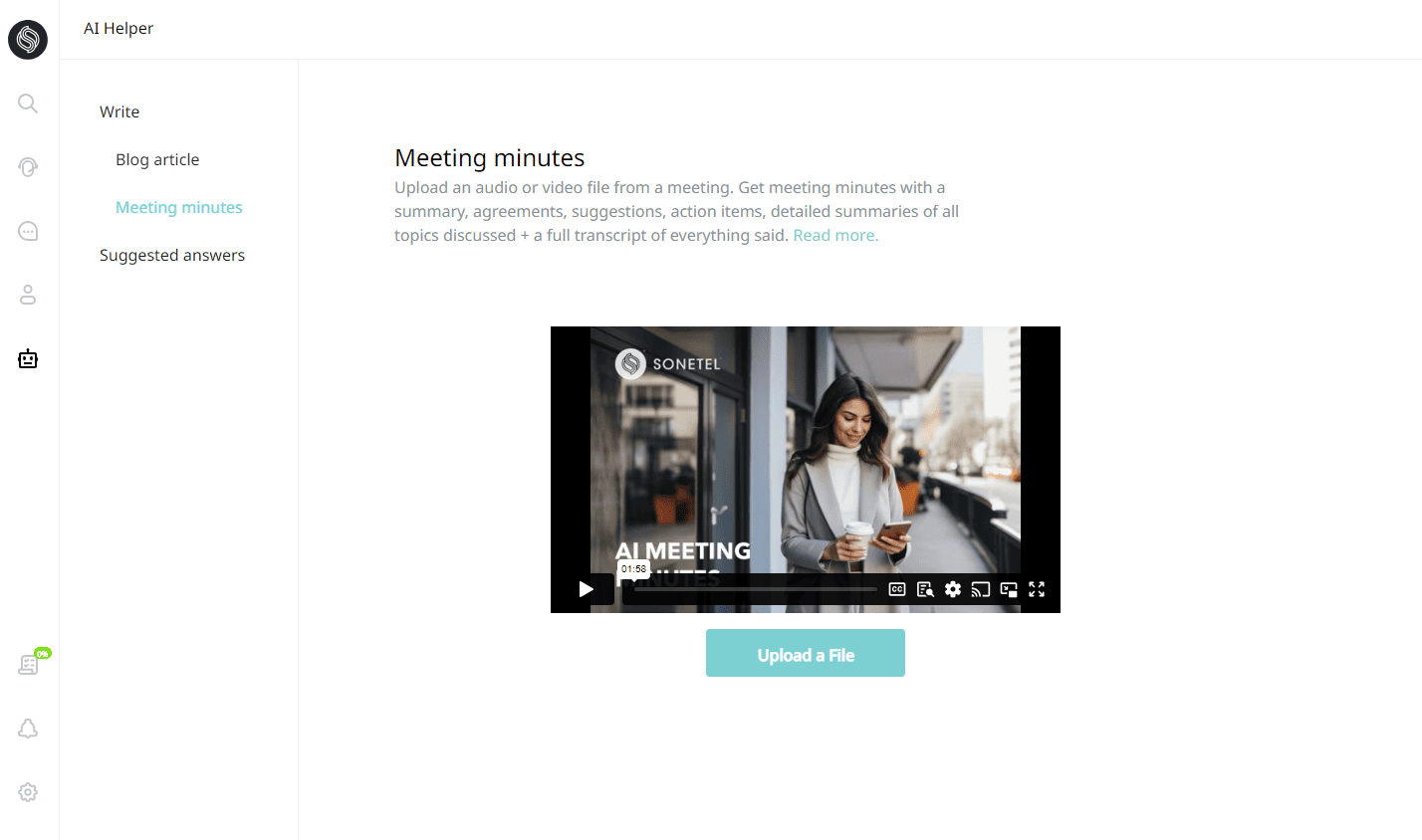 AI icon on the left to come to the Meeting Minutes page. - Hit the 'Upload a file' button to upload the recording of your meeting.