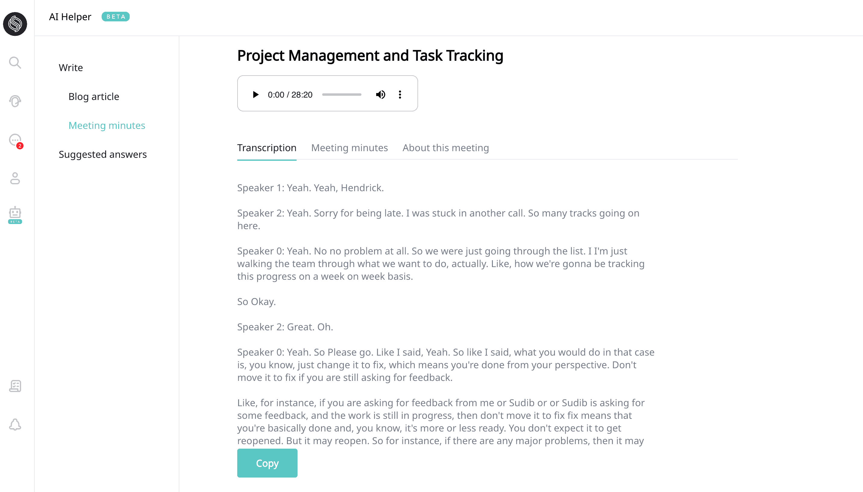 - Transcription This section contains the raw transcription, providing an option to copy everything.