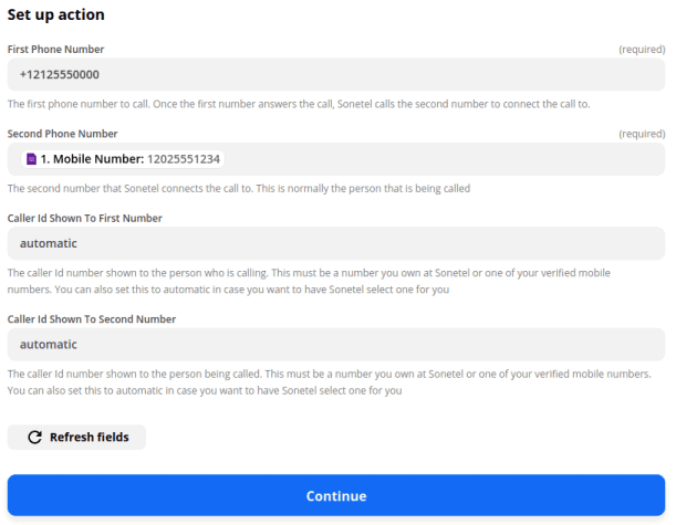 3. Why are my calls not working? This can sometimes happen if the phone number isn't entered in the correct format. Please ensure that the phone numbers to be called are entered without any spaces or hyphens. For example, if the number 212-555-1234 is from USA, it should be entered as 12125551234. If the Second Phone Number is being entered by your customer, we recommend adding a control in the form they submit so that they enter the number in the correct format. In case the phone number was entered in the correct format, and your Sonetel account has adequate balance to make calls please contact us with the details of the call that failed. 4. What number will my customer see as the caller ID? This depends on your caller ID settings. If you do not have a number with us, or have a phone number without a paid plan, then your customers will see your verified mobile number as the caller ID. If you do not have a verified mobile number or a Sonetel phone number in your account - both you as well as your customer will see a phone number owned by Sonetel. 5. The person I call does not see my Sonetel phone number as the caller ID? Please check your caller ID settings and ensure your Sonetel number is set as the number to be shown when you call. Phone numbers can only be shown when you have subscribed to a paid plan and have verified your account. 6. Why does it take a long time for the call to initiate after the customer submits the form? If your Zapier account is on the Free or Starter plan it may take up to 15 minutes for Zapier to take an action after a trigger condition is met. 7. How does the automatic caller ID setting work? For Callback calls, in the first part of the call you will always see a Sonetel phone number as the caller ID. When you answer, the second person that is being called will see one of the following numbers as the caller ID