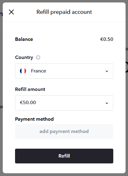 - Click on Refill Clicking on the Refill button opens the following view where you can change the country of your account.