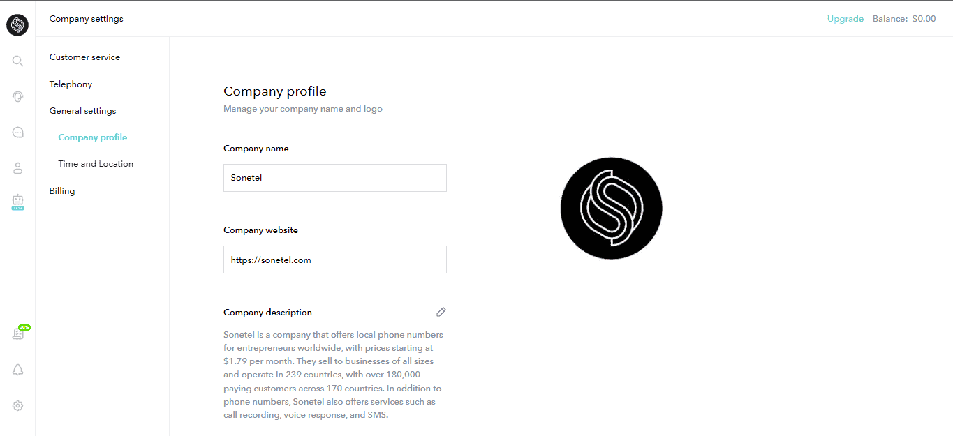 Update your company information such as name, website and logo. These details are used by our different services. The company name and website are used by our AI services to automatically prepare a description of your company. This description is used by the AI to understand your business when offering various services.