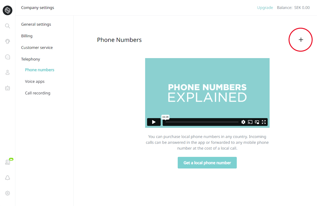 To buy phone numbers, go to the Phone numbers page in the web app. You find it by clicking on the