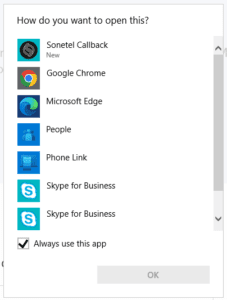 - Use the click-to-call function If you see a phone number as a link on a website, click on it and select the 'Sonetel Callback' app to call that number. Make sure 'Always use this app' is checked to reduce the number of steps for the next time. When you use this function, the phone number you clicked is automatically entered in the app.