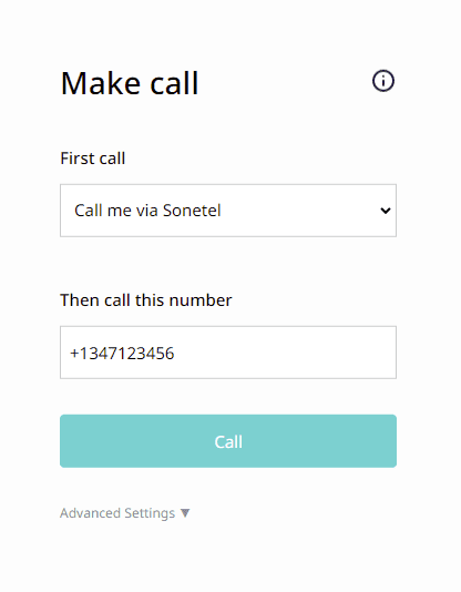- Optionally change call back method ("First call") You can select if the initial call to you should go directly to your mobile number or any other number. You can also have the call connected to you as a Sonetel user, allowing you to answer the call with the Sonetel web app or with some 3rd party SIP phone connected to your user account.