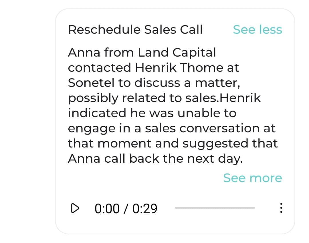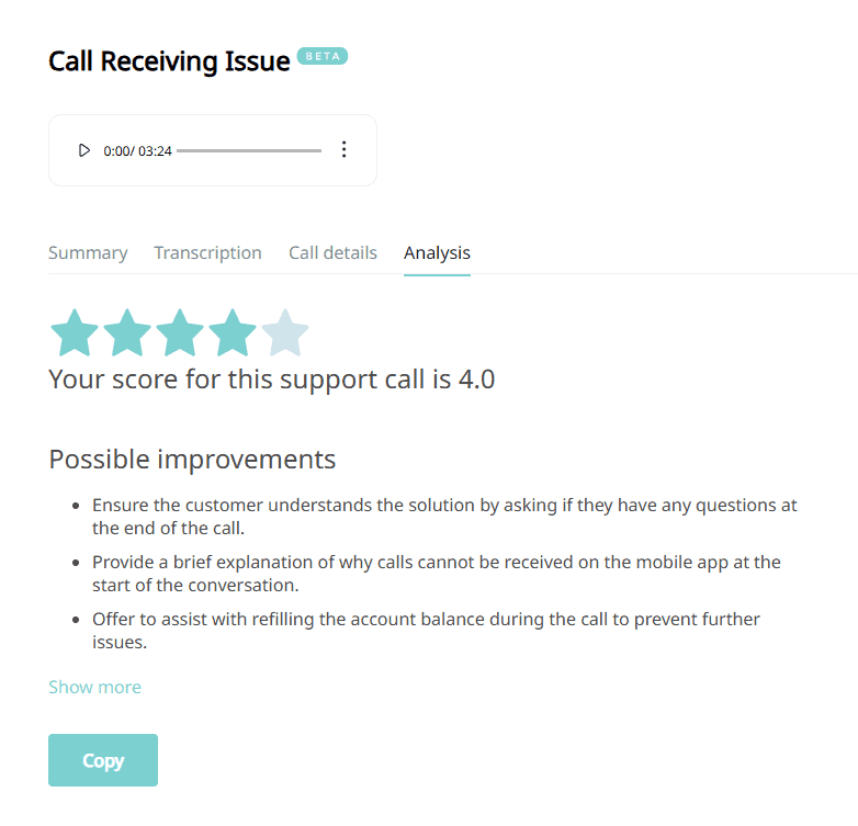 You can copy and share the analysis. On the call recordings page You can also find the Customer Call analysis via the Call recordings page, which lists all your recorded calls. You can find the page by clicking on the phone symbol in the left navigation bar and selecting Call recordings. By clicking on a recorded call in the list, and then selecting Analysis, you will be able to see, copy and share a detailed summary of each call. Only calls that have a score in the list have an analysis. Language detection The language spoken in the call is detected automatically. The analysis is provided in the same language. This will work for most major languages. How can I activate customer call analysis? You can activate call recording here, which will also activate call analysis. Please note that you must have Premium or Business plan to activate Call recording.