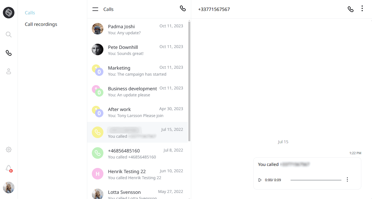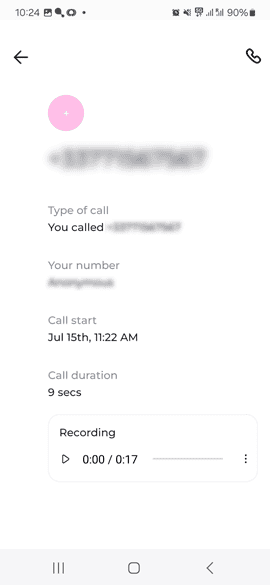 Team members that make calls - or receive calls via Sonetel phone numbers assigned to them - will see their call recordings in the regular conversations in the Sonetel apps. This is what it looks like in the mobile app.