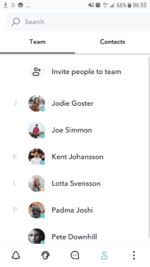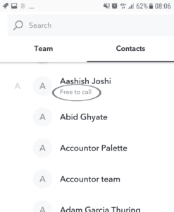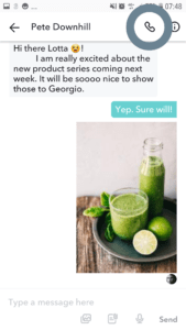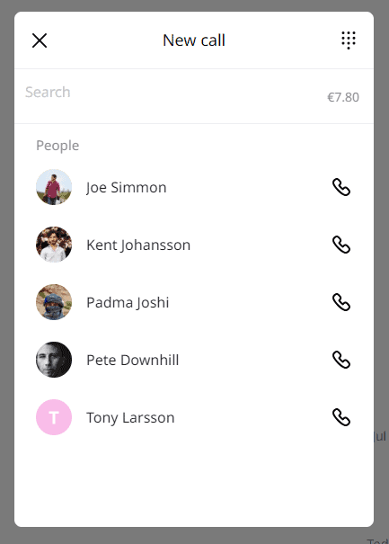 - Select from contacts. Click on the phone icon next to a contact or team member in the list. Your personal contacts will appear here if you have allowed us the access to these in the mobile app.