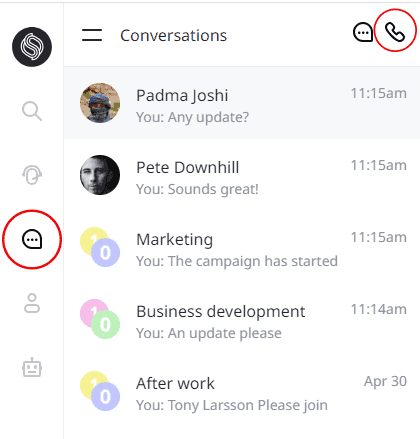 Each phone number you call to - or receive a call from - generates a conversation in the conversations list. This is where you will find call recordings and logs of calls made or received. In each such Conversation it is possible to click on the phone icon to start a call to the same person/number.