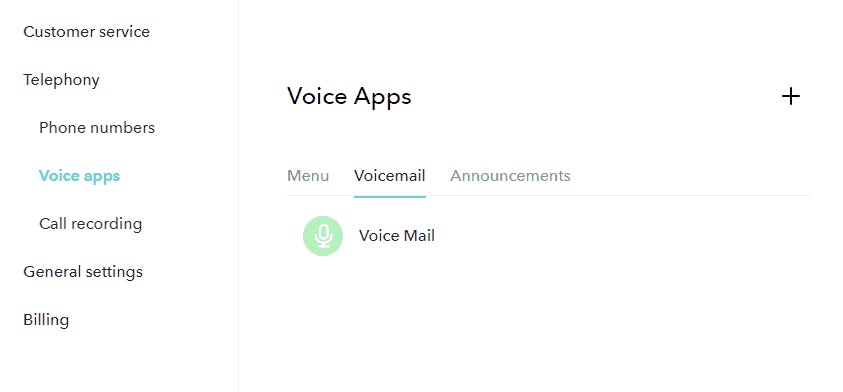 To create additional voicemail boxes for support, sales or other functions in the Voice app section in the account settings. You can create as many voicemail boxes as you want but only accounts with a paid plan can connect calls to voicemail boxes. Advanced users can however connect calls to the Voicemail box for free via SIP.